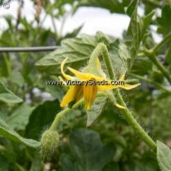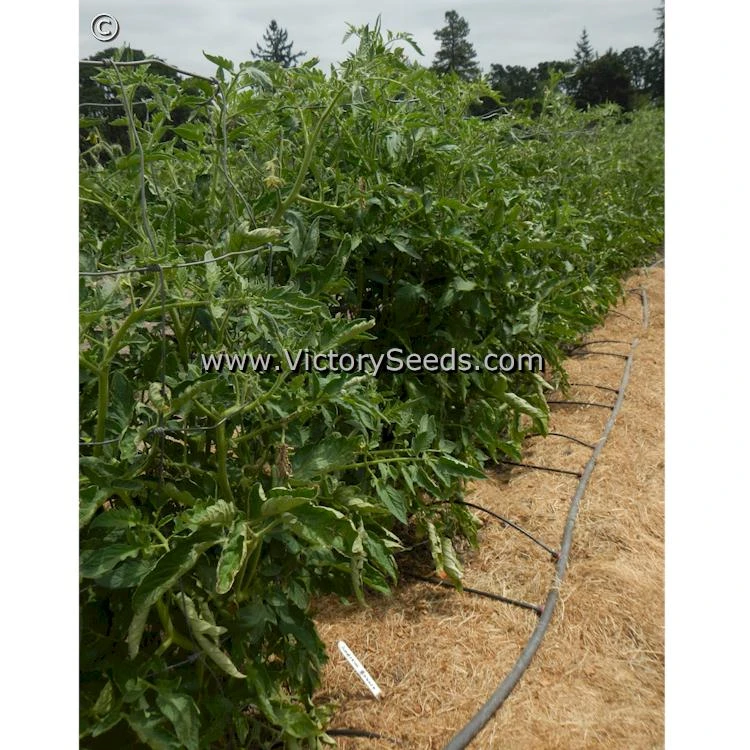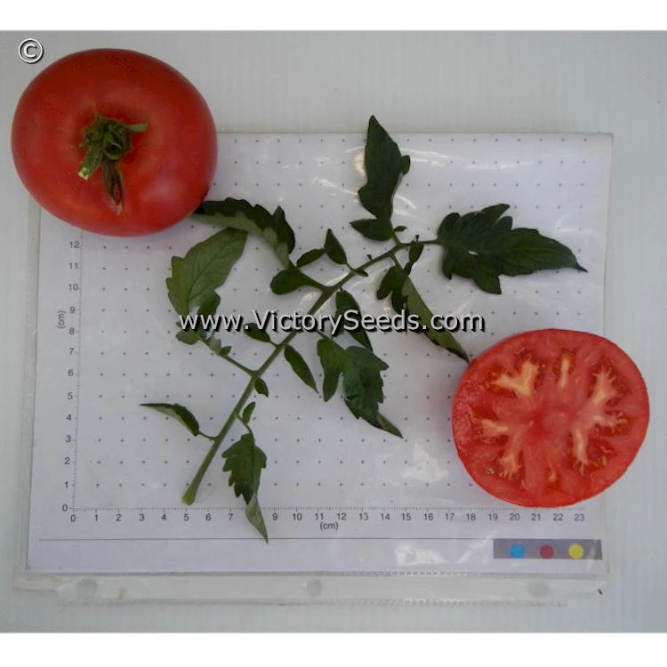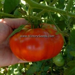 90 days, indeterminate — The regular leaf vines of ‘Andrew Rahart’s Jumbo Red’ grow to about five feet tall and produce red, oblate shaped, eight to eighteen ounce fruit that are large, delicious, meaty and juicy, as well as sweet and tangy. Although the fruit average around one pound each, they can grow much larger.