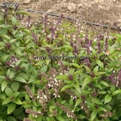 75 days – Known as ‘Thai’ or ‘Licorice’ basil, this variety grows up to around fifteen inches tall with leaves reaching up to two inches long. The leaves have a distinct but subtle licorice or anise aroma and flavor, which is excellent when used in Thai, or other traditional Asian cuisine. The stems are purplish-red with small burgundy flowers that are in bloom in the summer. Plant in well drained soil in a location that receives full sun throughout the day. Each packet contains one gram of seeds. An annual plant.