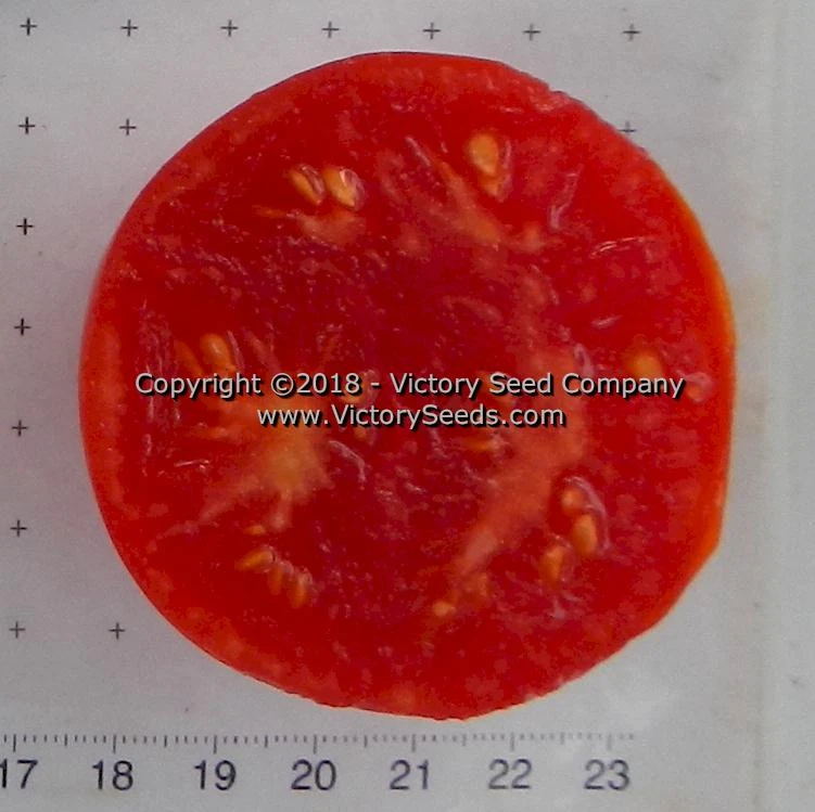 68 days, determinate — ‘Bison’ has compact, two-foot tall, regular-leaf plants that produce round to oblate shaped, red colored, two to eight ounce tomatoes. They are juicy with a complex, mildly tart flavor. ‘Bison’ is well suited for fresh eating as well as for canning.