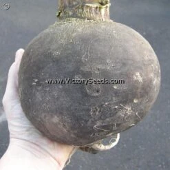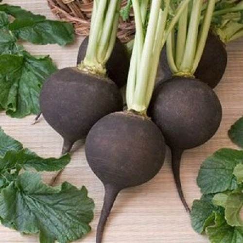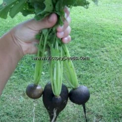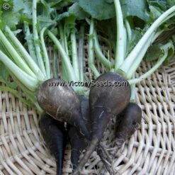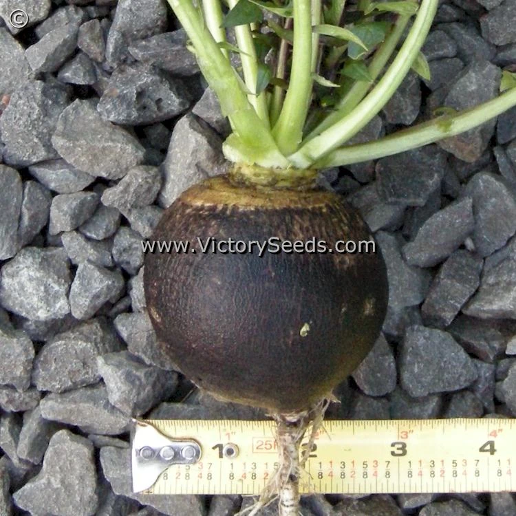 60 to 80 days — ‘Black Spanish Round’ radishes develop into large, turnip-shaped globes that reach up to three inches in diameter with tall tops. The skin is blackish colored and its flesh is solid, crisp, and typically pungent (hot). As they are generally used for winter storage, sow in July or August, and store in moist sand after harvested.