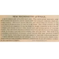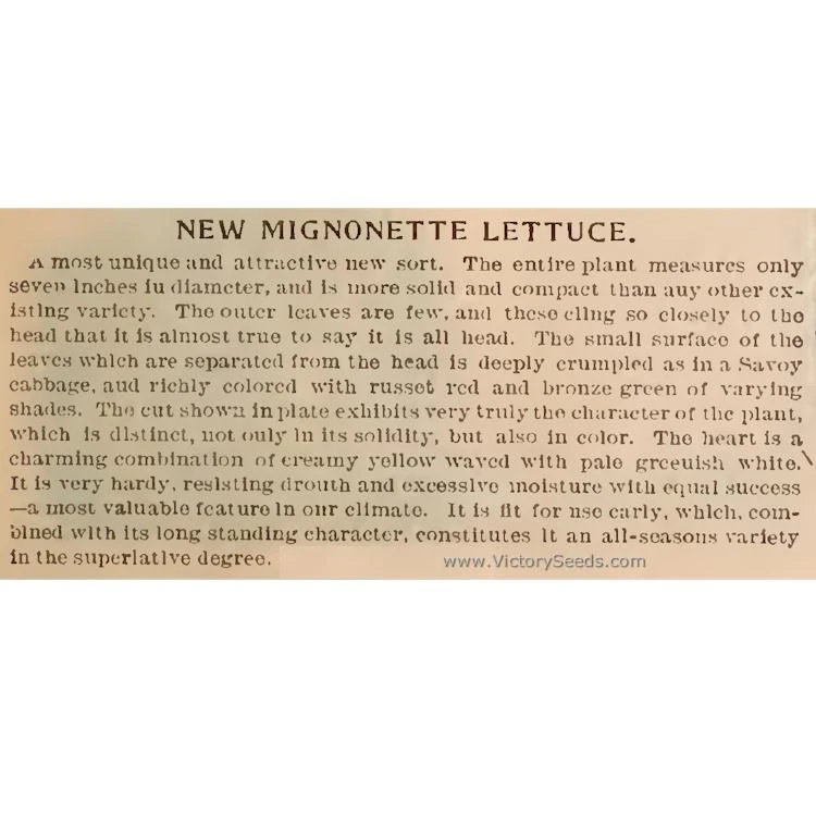 65 days — ‘Bronze Mignonette’, also known simply as ‘Mignonette’, is a very old, butterhead-type lettuce. The globular heads have frilled leaves that are green-on-bronze colored with hearts that are creamy colored. The plants are small, compact, and it is slow to bolt and suitable for hot weather.