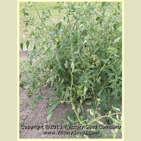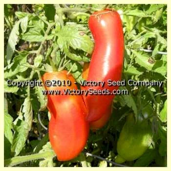 80 days, indeterminate — This paste-type tomato is both beautiful and excellent tasting. The fruit of ‘Burning Spear’ are a vibrant dark-orange color, elongated in shape, with some fruit exhibiting a pointed, reddish blush on the tips. The vines have wispy, regular leaves, and are productive.