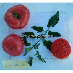 90 days, indeterminate — The regular leaf vines of ‘Carter’s Mortgage Lifter’ produce beautiful, large, pink, eight to twenty ounce, oblate-shaped, beefsteak-type fruit. One-pounders are common. They are meaty but juicy, delivers a nice, mild, balanced flavor that leans towards the tart side. After our fall rainy season started, ‘Carter’s Mortgage Lifter’ plants and fruit still remained healthy and held up well without splitting or rotting.