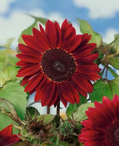 80 to 90 days — The petals of ‘Chocolate Cherry’ sunflower are a deep burgundy color radiating out from a dark-chocolate colored center. The flowers are five to eight inches across on plants that are heavily branching and reach six to seven feet in height. They are quite beautiful left alone as a focal point along the backs of your flower beds or along a south-facing fence. If you like to brighten your home with cut flowers, ‘Chocolate Cherry’ sunflowers are gorgeous and long-lasting in vases.