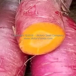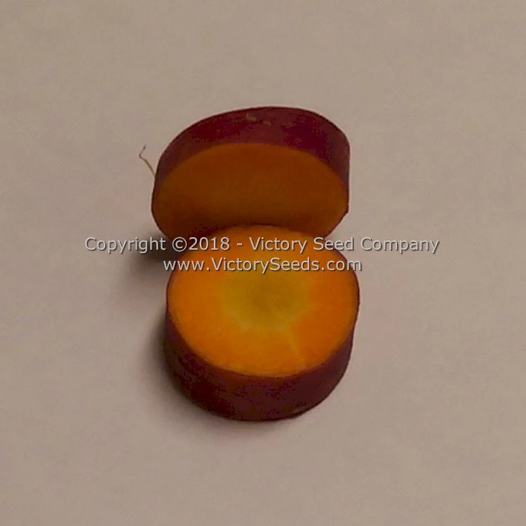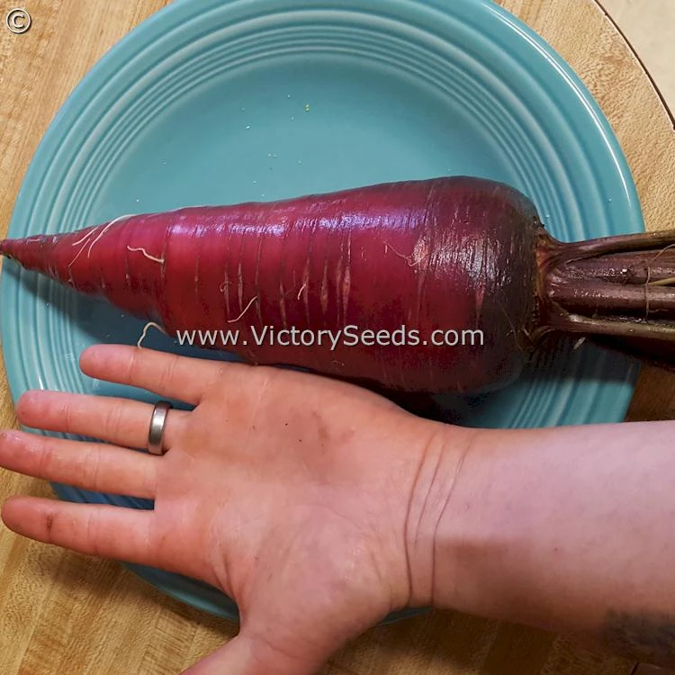 ‘Cosmic Purple’ plants are large, reaching fifteen to twenty-four inches in height, and produce carrots that are bright purple in color on the outside and orange on the inside. They make an interesting, tasty, and sweet addition to a veggie platter. ‘Cosmic Purple’ is a six to eight inch long, Danvers-type carrot.