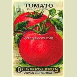 ‘Dwarf Champion’ is one of the first named tree-type varieties. It was selected from a cross between a now unknown variety and ‘Tomato de Laye’.[1] Our parent stock source was GRIN accession number PI 270180. Each packet contains approximately 20 seeds.