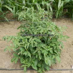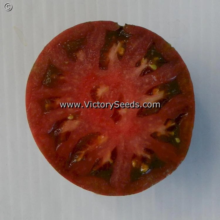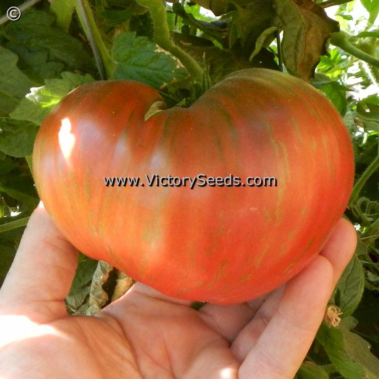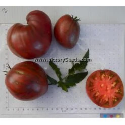 90 days, dwarf — The rugose, regular leaf plants of ‘Dwarf Chocolate Heartthrob’ are prolific. Its fruit are six to ten ounces each, strongly heart-shaped, and a rich mahogany chocolate in color with nearly metallic looking green stripes. The interior is a rich burgundy crimson with a well balanced, very delicious and classic “tomato-ey” flavor.