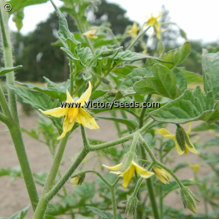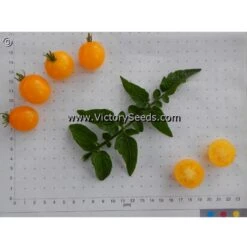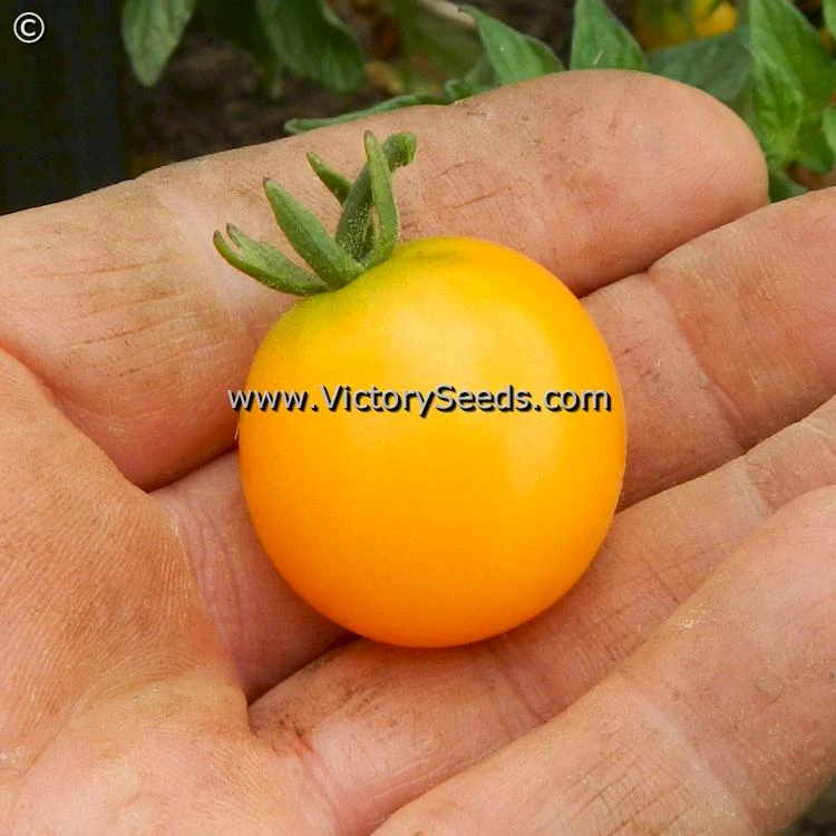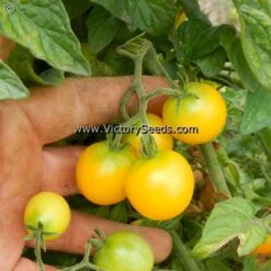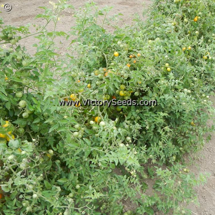 60 days, dwarf — The rugose, regular leaf plants of ‘Dwarf Eagle Smiley’ look like a smaller version of a standard cherry-type tomato plant, reaching about five feet in height. They are extremely productive and loaded with one ounce, bright to golden-yellow, globe-shaped fruit that are borne in clusters of eight to ten tomatoes. In spite of their small size, these little flavor bombs explode in your mouth with an intense sugary goodness that at first masks the fact that you are eating a tomato, and lingers long enough that you are assured that you did. Its outstanding flavor, perhaps the best flavored of all of the released dwarf cherry-types to date, is on a par with the best indeterminate and hybrid varieties.