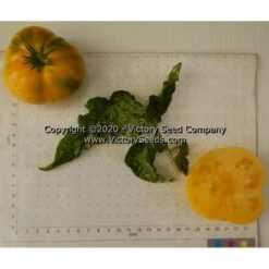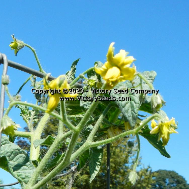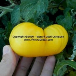 90 days, dwarf — The rugose, potato leaf plants of ‘Dwarf Elsie’s fancy’ are attractively variegated. They produce medium to large sized, four to twelve ounce, oblate shaped, bright yellow fruit. The fruit size, shape, flavor, and days to maturity are the same as with ‘Dwarf Walter’s Fancy‘, the main difference being skin color.