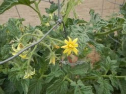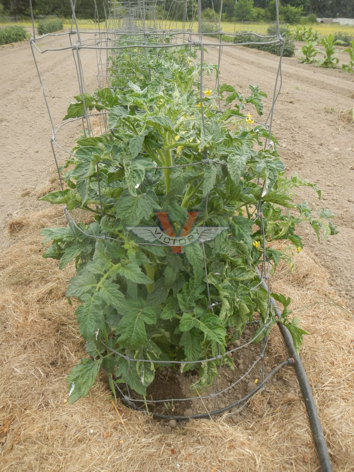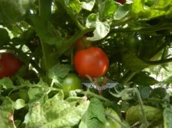 70 days, dwarf – The rugose, regular leaves of ‘Dwarf Flashy Ace’ are variegated on plants that are compact (3 to 4 feet in height) and very productive. Its fruit are pink in color, globe to oblate shaped, borne in clusters of 6 to 8, and easily slip from the plants when ripe. They are tasty, juicy and mildly sweet.