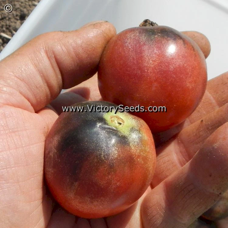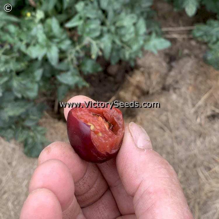 65 days, dwarf — ‘Dwarf Mocha’s Cherry’ has compact, eighteen to twenty inch tall plants with rugose regularly leaf foliage that display a purplish cast, indicative of varieties containing the anthocyanin gene. The fruit are abundant, round, small (about one ounce each), and a glossy deep purple color, some with green shoulders, that becomes nearly black when exposed to the sun. As the fruit ripen, the purple dulls, the green turns red, and they soften. The flavor is generally mild and pleasant but can be on the tart side.