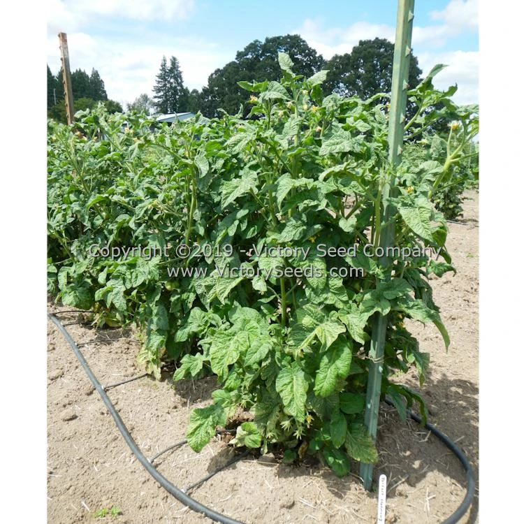 85 days, dwarf — ‘Dwarf Perfect Harmony’ has rugose, potato leaf plants that reach four to five feet tall and produce good amounts of medium-large, up to twenty ounce, bright-orange colored, oblate shaped tomatoes with a distinctly tart, full flavor. A wonderful slicing tomato on compact, dwarf plants.