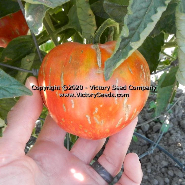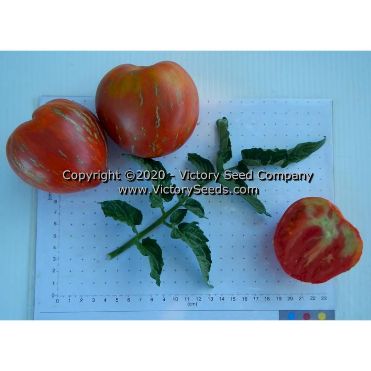 75 days, dwarf — The rugose, regular leaf plants of ‘Dwarf Speckled Heart’ produce smooth, five to twelve ounce, heart shaped tomatoes that are scarlet red in color with golden stripes. Though its meatiness makes it perfect for sauces, the depth of its balanced, rich flavor make it perfect for sandwiches and salads.