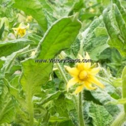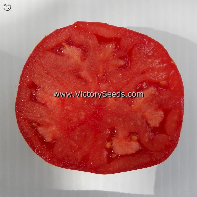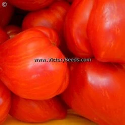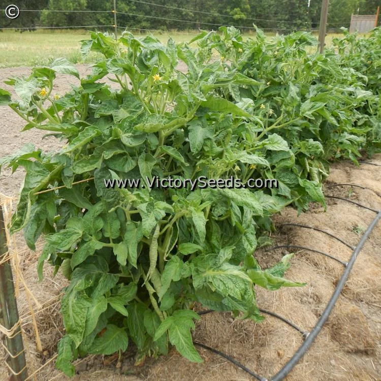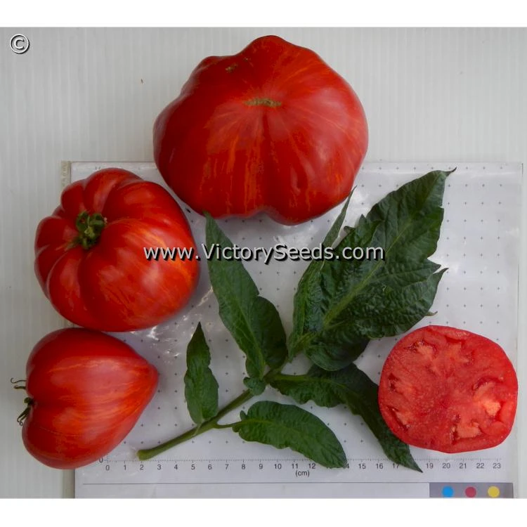 Indeterminate. 80 days, dwarf — The rugose, potato leaf plants of ‘Dwarf Stony Brook Heart’ are quite compact, reaching thirty-six to forty-eight inches tall, and are very productive. The distinctly heart-shaped tomatoes are a beautiful scarlet color with distinct jagged golden stripes. Most fruit run between six to ten ounces but they can reach one pound or more. The meaty flesh has a classic tomato flavor with an initial burst of sweetness, making them very versatile, perfect for sauce, paste, preserving and slicing.