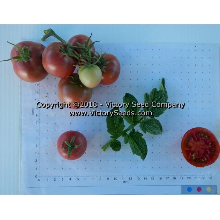 70 days, dwarf — ‘Dwarf Velvet Night’ has rugose, regular leaf plants that are very productive. The cherry-type fruit are purple in color and vary in size from one to three ounces each. Excellent flavor.