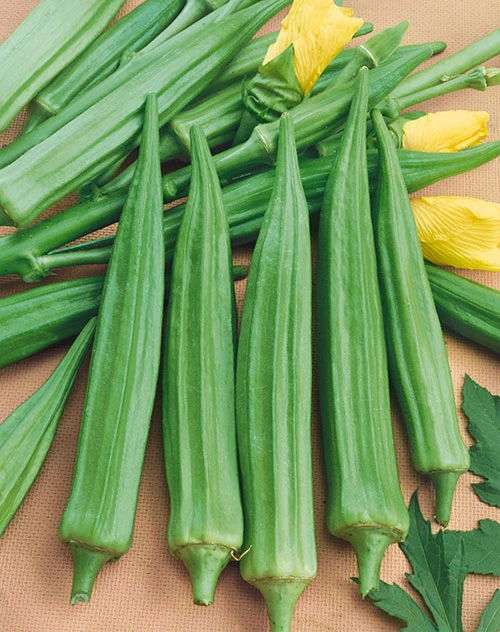 55 days — ‘Emerald’ okra, also known as ‘Velvet’, ‘Emerald Green’ and ‘Emerald Green Velvet’,[1] have pods that are thick walled, round, slender, long, spineless, and a deep green color. Its plants are semi-dwarf with large leaves.