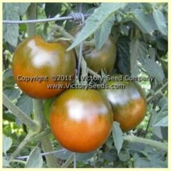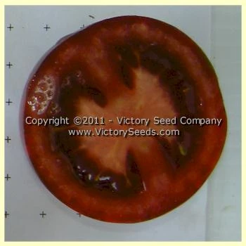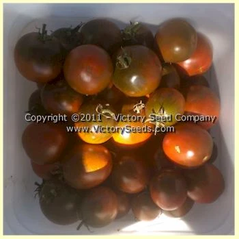 75 days, indeterminate — The plants are beautiful with grayish foliage. The fruit are globe-shaped and a dark purple color that grow in clusters of about six fruit. They have an excellent meaty texture and sweet flavor with a nice “tomatoey” finish but not acidic or tart. Thin skin, meaty flesh, seeds and juice in two cells.