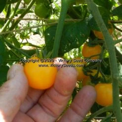 75 days, indeterminate — Also known as ‘Galina’s Yellow’ and ‘Galina’s Yellow Cherry’, ‘Galina’ has potato leaf plants that bear large clusters of one-inch, yellow colored, cherry tomatoes that have a very sweet, tasty, well-balanced but complex flavor.