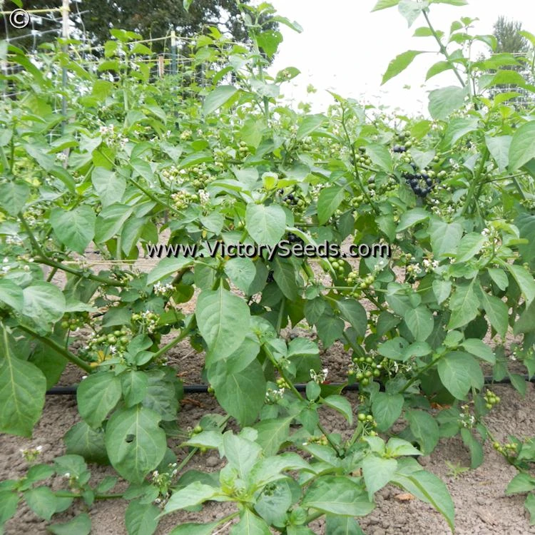 80 days — Although a lot of companies state that this is a “new” plant variety, it has in fact been cultivated for many decades. An interesting looking plant, similar to tomato plants with pepper-like leaves. They reach about three feet in height and produce hundreds of, half-inch, dark purple, almost black, fruit.