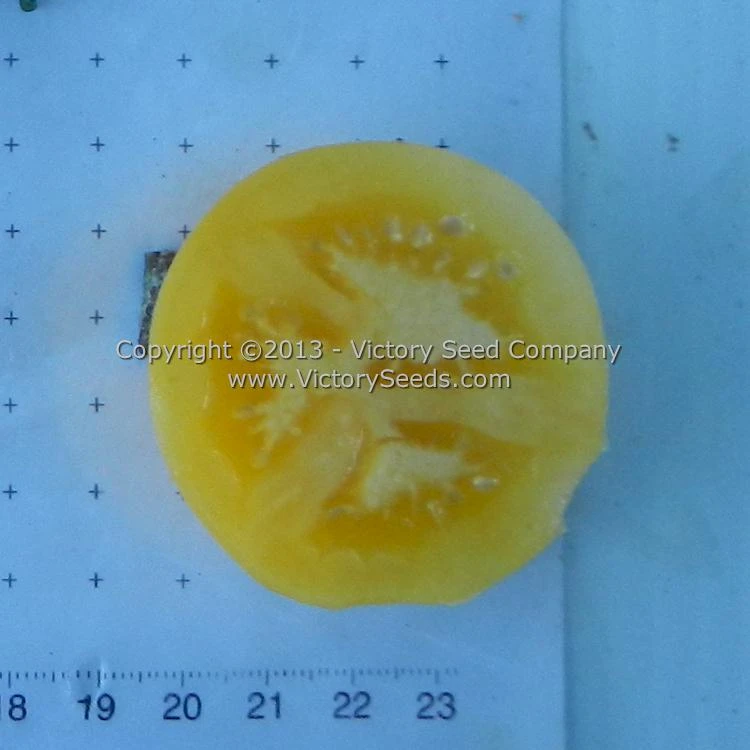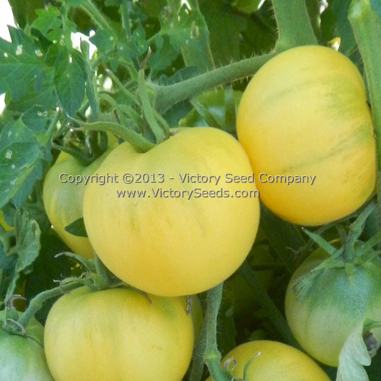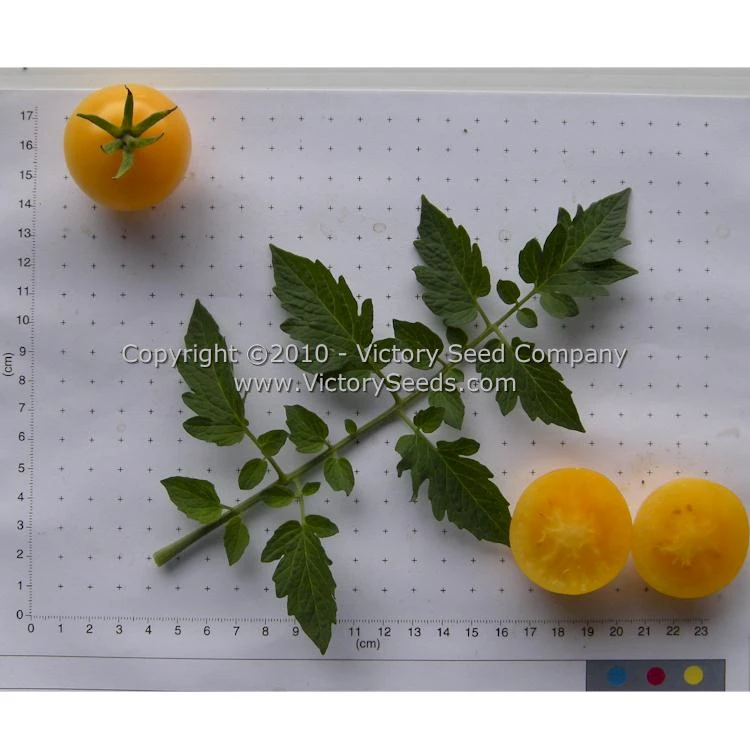 90 days, indeterminate — Also known as ‘Yellow Peach’, ‘Garden Peach’ is an old commercial heirloom tomato variety. Its vigorous, regular leaf plants produce globe-shaped fruit that weigh from one to three ounces each, are a beautiful yellow color, and exhibit a characteristic pubescence (fuzziness) on their surface; much like a peach. The fruit store well and have a good, slightly sweet, mild flavor.