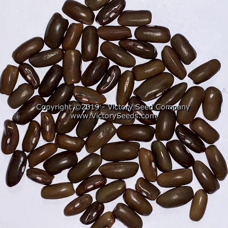 ‘George’s Fowler’ bean was sent to us by seed saver Jeff Fleming (MI FL J), who had received a sample of an F1 cross from seed saver George McLaughlin (OK MC G) who noticed that it had attributes of the original ‘Fowler’ bush bean, but as a pole-type variant. Its seeds had the characteristic “coffee bean” color and as noted above, Jeff noticed that it lacked the typical, strong scent of most green beans. Jeff also observed that Japanese beetles basically ignore this variety, especially when other, more attractive plants are planted nearby.