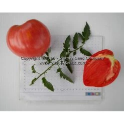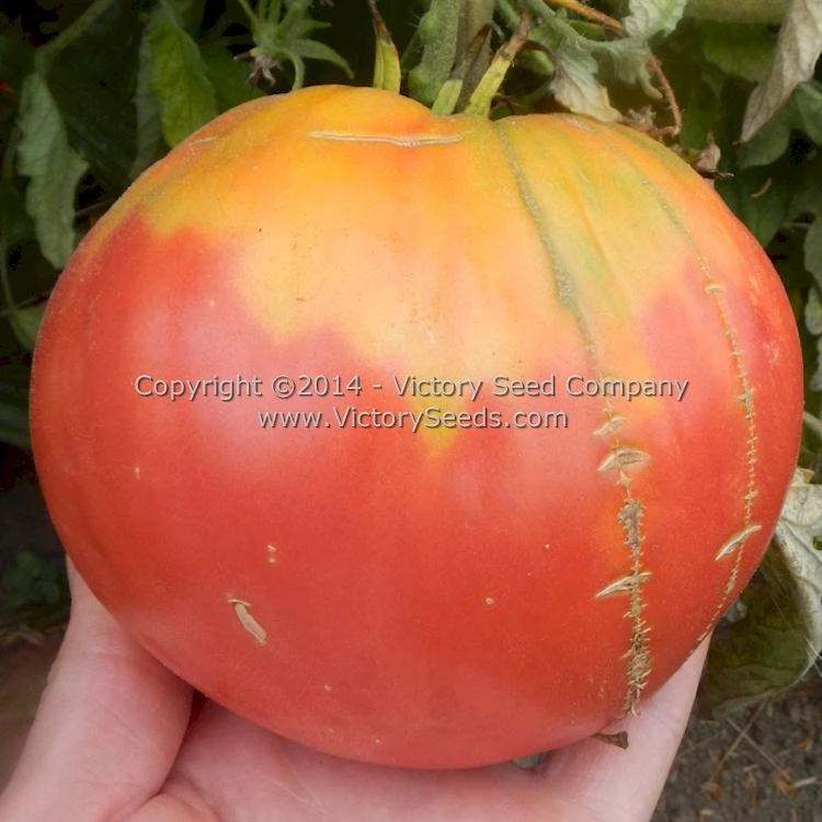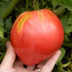 84 days, indeterminate — These gigantic, pink, heart-shaped tomatoes ranged from thirteen to thirty-two ounces! Here in Oregon they did seem to be a bit prone to vertical cracking late in the season but this did not affect their use. Most of the fruit have prominent points on the blossom ends.