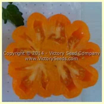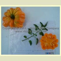 80 days, indeterminate — The regular leaf plants of ‘Golden Accordion’ produce large (up to twenty ounce), golden-orange colored, deeply ribbed, oblate shaped fruit. Identical in every way except for color to ‘Pink Accordion’.