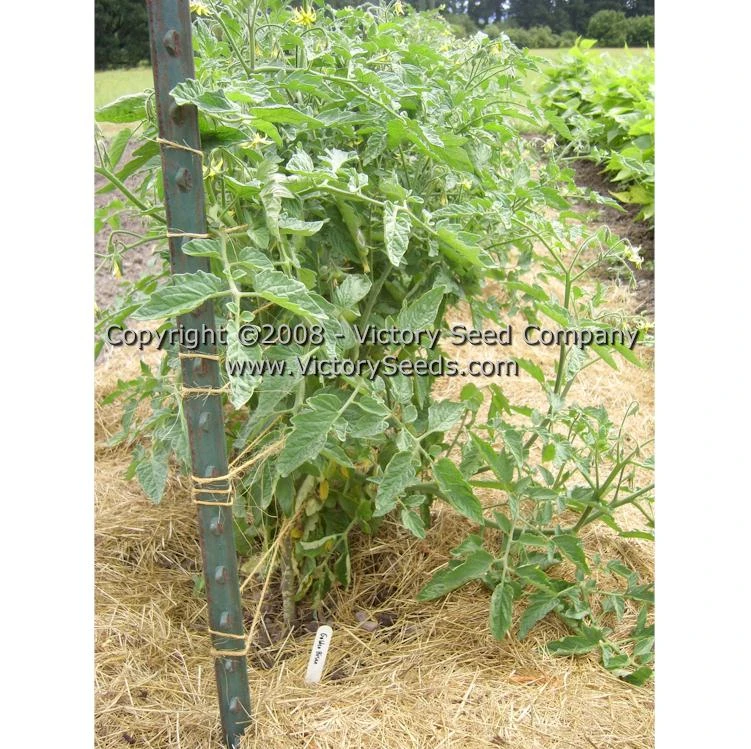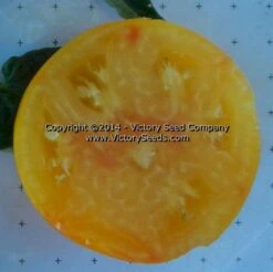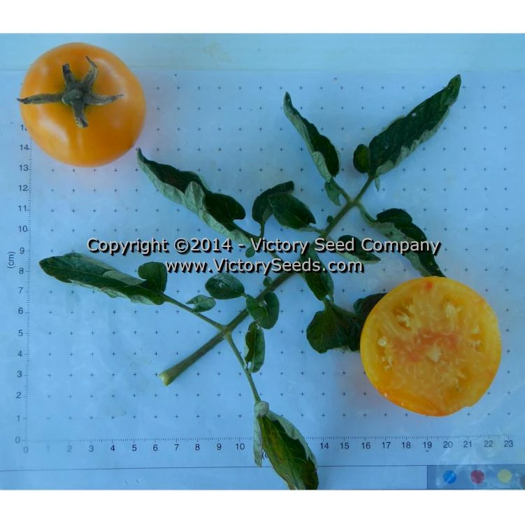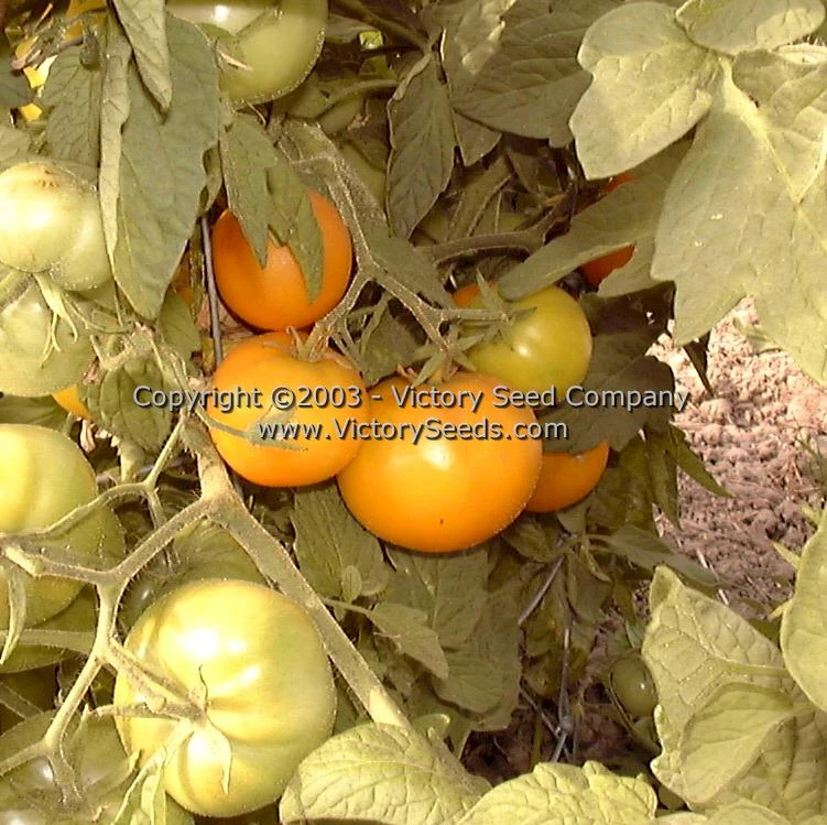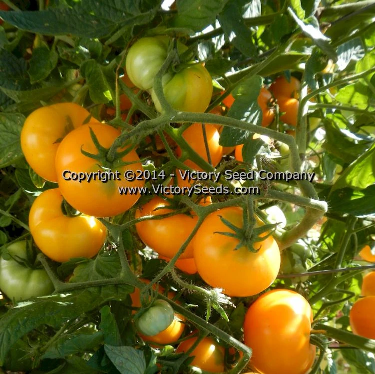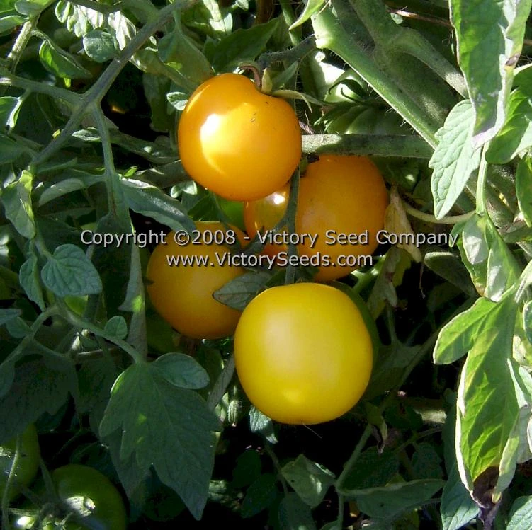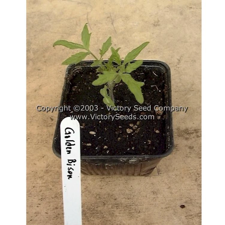 59 Days, determinate — The compact plants of ‘Golden Bison’ are very productive. The fruit are medium-sized, globe-shaped (slightly flattened), and golden-yellow in color. Some specimens we observed developed a slight blush on the blossom end, like its parents, ‘Golden Queen‘. They are mild flavored, sweet and juicy.