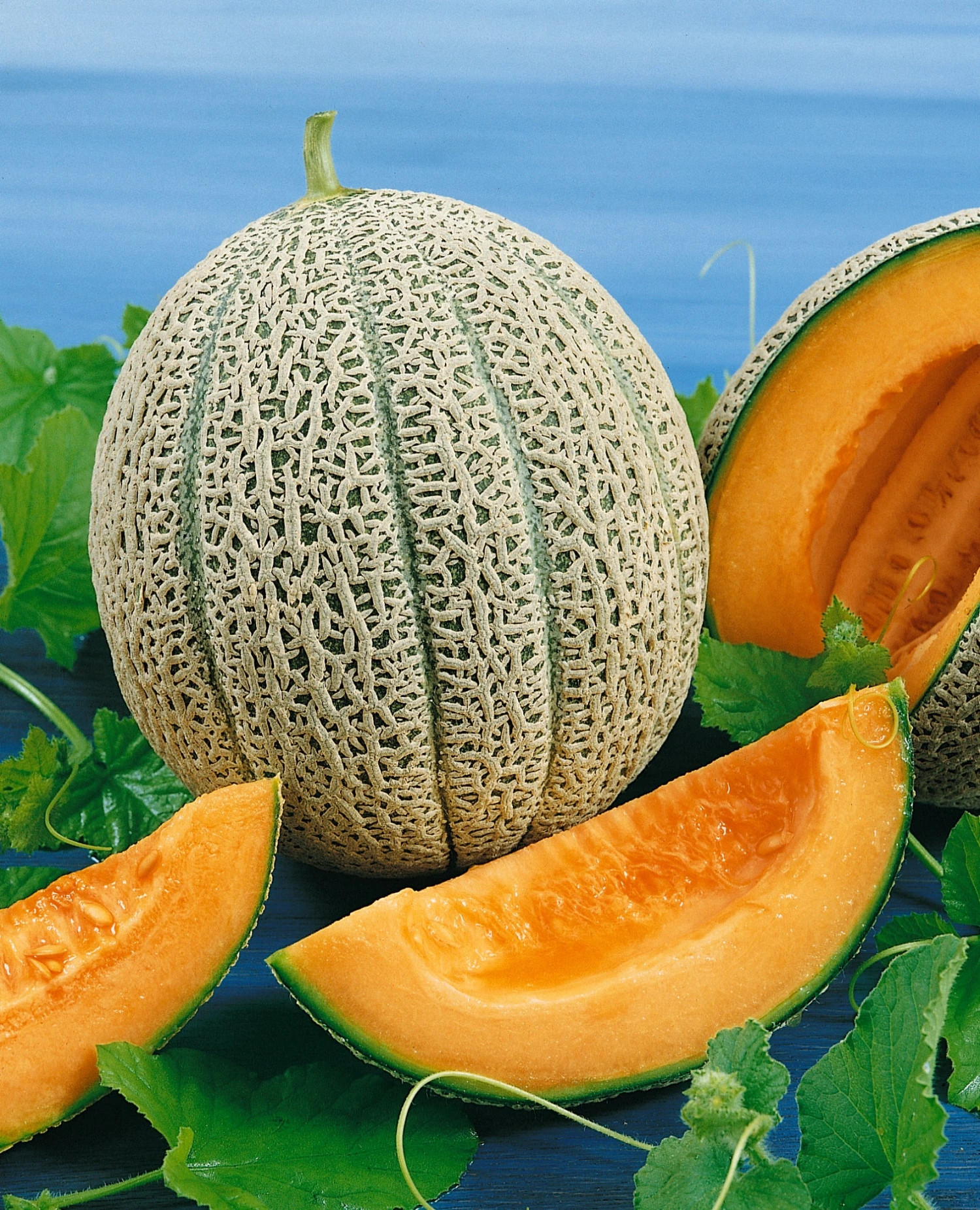 85 days — The fruit are early large, oval-shaped fruit with heavy netting and thick, salmon-orange flesh. They average three and one-half to five pounds each. Introduced in 1924.[1]