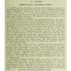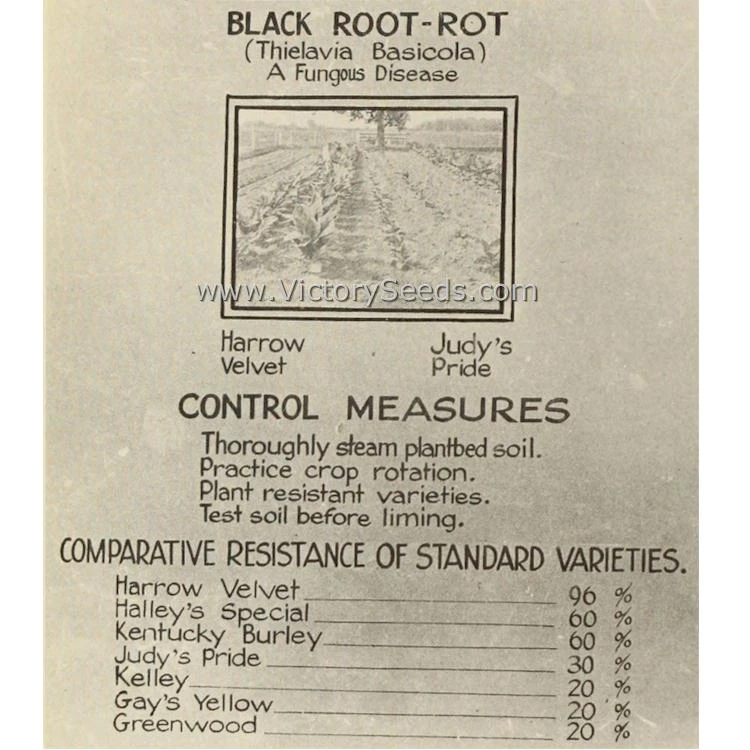 Introduced in about 1935, ‘Harrow Velvet’ is a multipurpose, “Burley-type” tobacco that was historically used for plug tobacco, cigarette and pipe blending, as well as for blending material for cigar filler. It produces large (up to twenty-four inch) leaves that ripen to a nice, golden-yellow color and was developed to resist Black Root-rot and is in fact, one of the most resistant.[1]