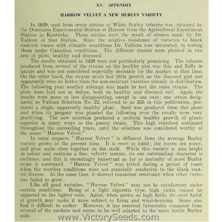 In 1929, seven strains of White Burley tobacco types were obtained by the Dominion Experimental Station at Harrow, Ontario, Canada from Dr. Valleau of the Kentucky Agricultural Experiment Station. Dr. Valleau had created the crosses and was interested in learning how they performed in Canada. The strains were all grown in a healthy field and one infected with black root-rot. Eventually, one plant out of a stain designated as ‘Valleau Selection No. 22’ emerged as resistant. It was further refined over succeeding years, “… until the selection was considered worthy of the name ‘Harrow Velvet’.”[2]