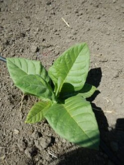 Its leaves curl downwards, are egg-shaped in outline, and attach to the stalks at the broad end of the leaf. They have a slightly puckered surface and are typically thirteen inches wide by twenty-six inches long. They are classified as a cigar binder type of tobacco.