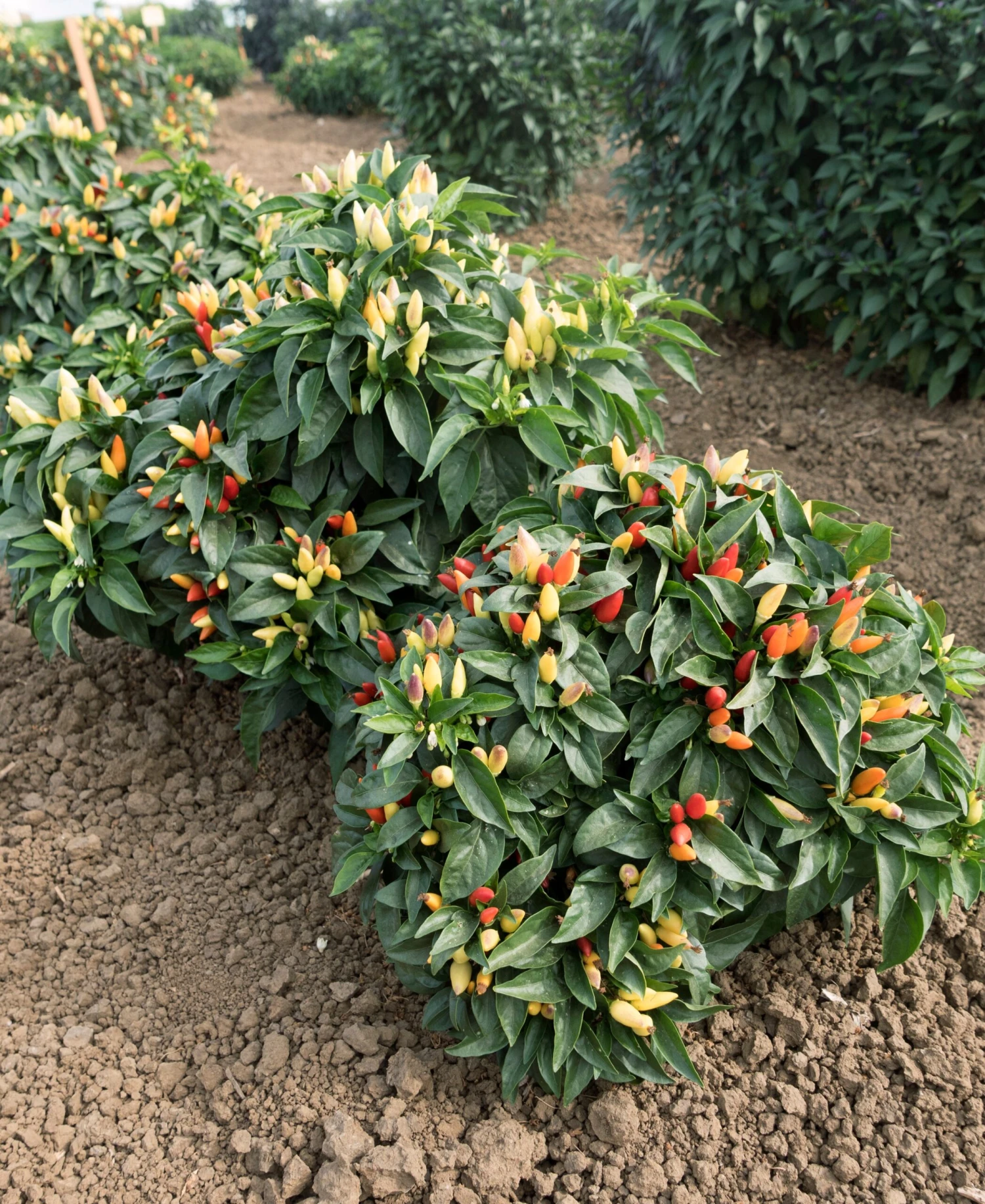 60 days to maturity. Holiday Time is a tiny nosegay-shaped plant that grows only 6 to 8 inches in diameter. The upright tapered fruit are like elongated thimbles and are clustered in the center surrounded by a halo of broad dark green leaves. These edible hot peppers are yellow when young and turn orange and scarlet as they mature. 1980 All-America Selections National winner.