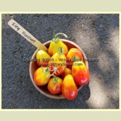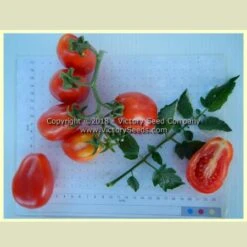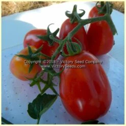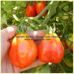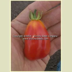 “This new Tomato, which we secured the past summer from an Italian grower, will prove of value to family gardens. It is pear-shaped, 2 to 2-1/2 inches long, by 1-1/4 to 1-1/2 inches wide, and of a beautiful rich red color, with very few seeds ; they grow 6 to 8 fruit in a cluster.“