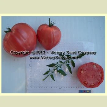75 days, indeterminate — ‘Kosovo’ plants have slightly willowy leaf growth and reach six to eight feet in height. Their fruit are pink, fleshy, and varying in shape — heart, double-heart, and large, flat shapes — all on the same plant, averaging one to two pounds in weight. A very tasty slicer-type variety.Very early for such large fruit.