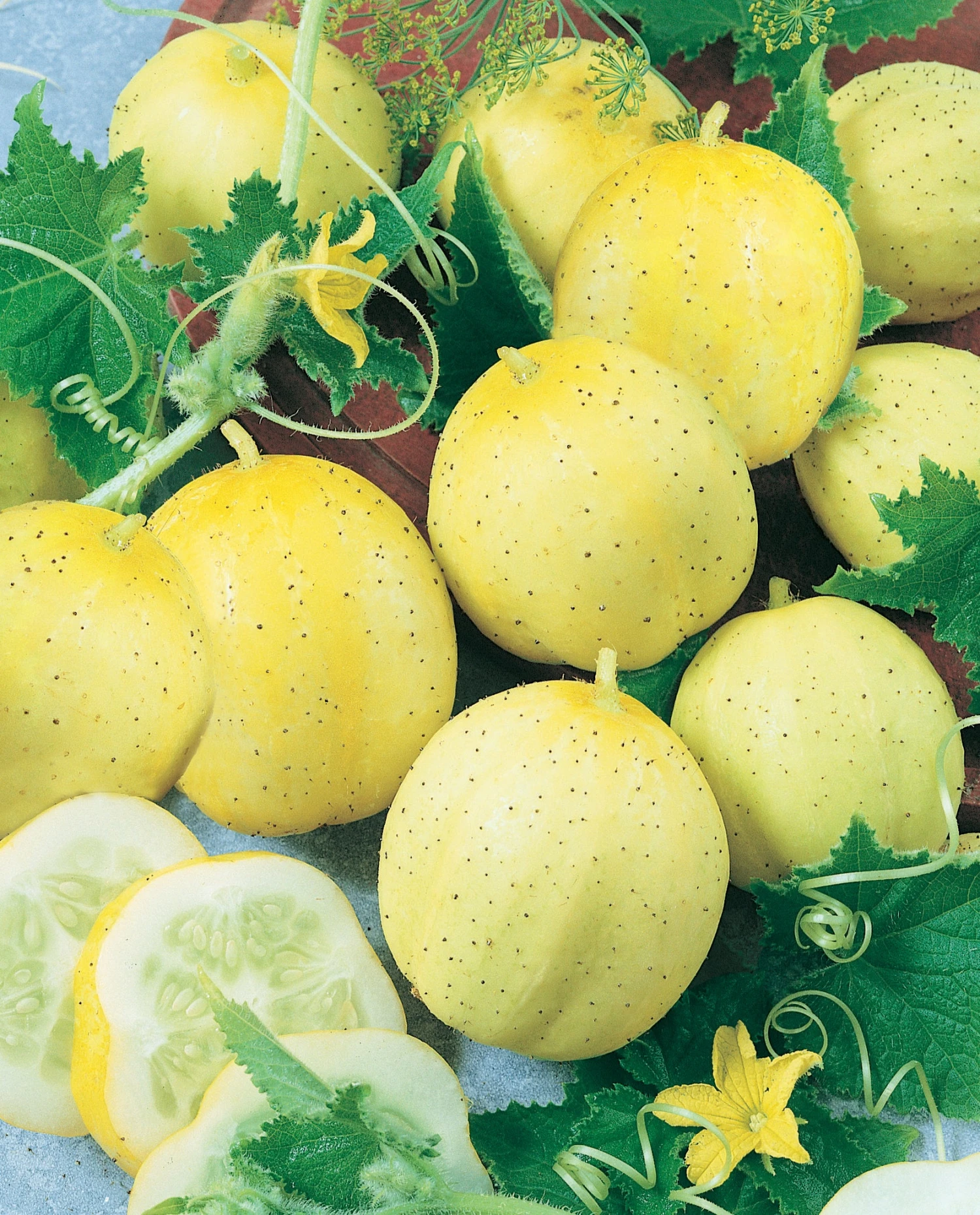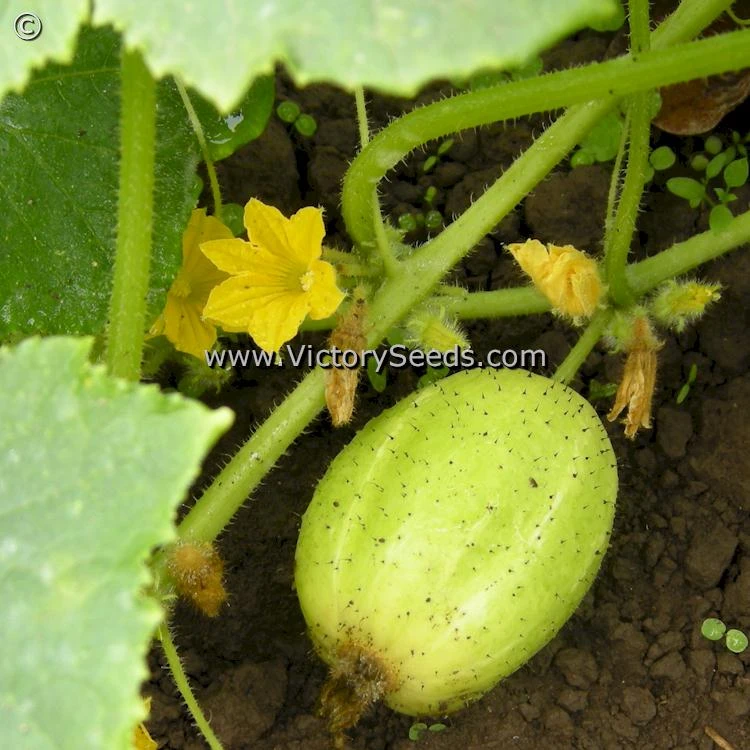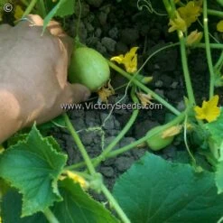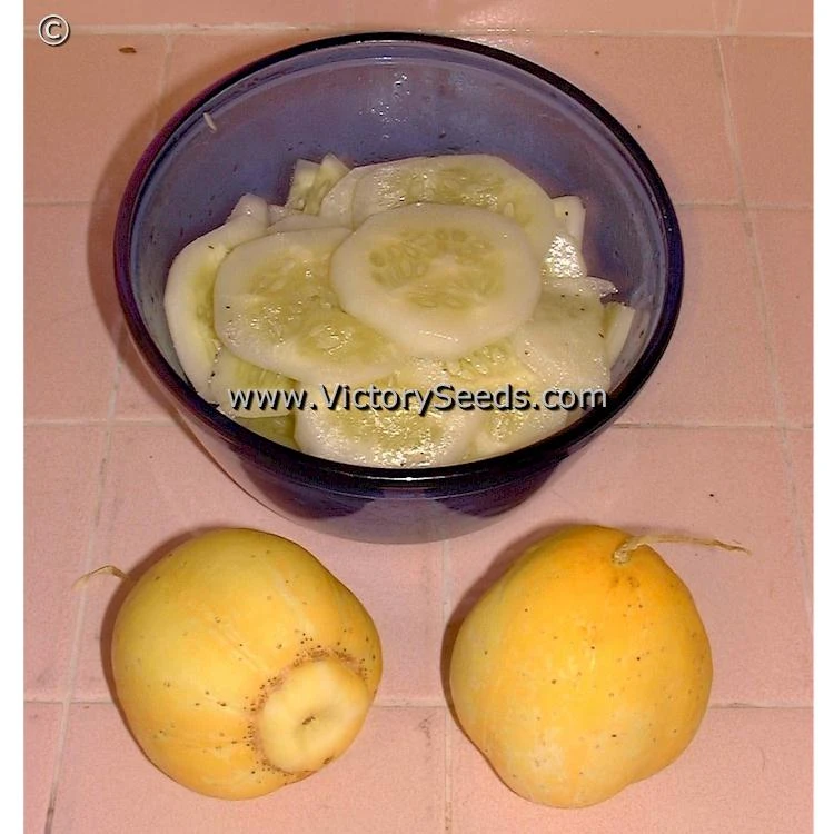 60 days — Also known as ‘Apple’ cucumbers, ‘Lemon’ cucumber vines are vigorous and productive, producing fruit about the size and color of a lemon. Flesh is crispy white, sweet, and burpless. The fruit is ripe when it first starts to turn yellow, but can be used green or ripe.