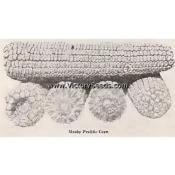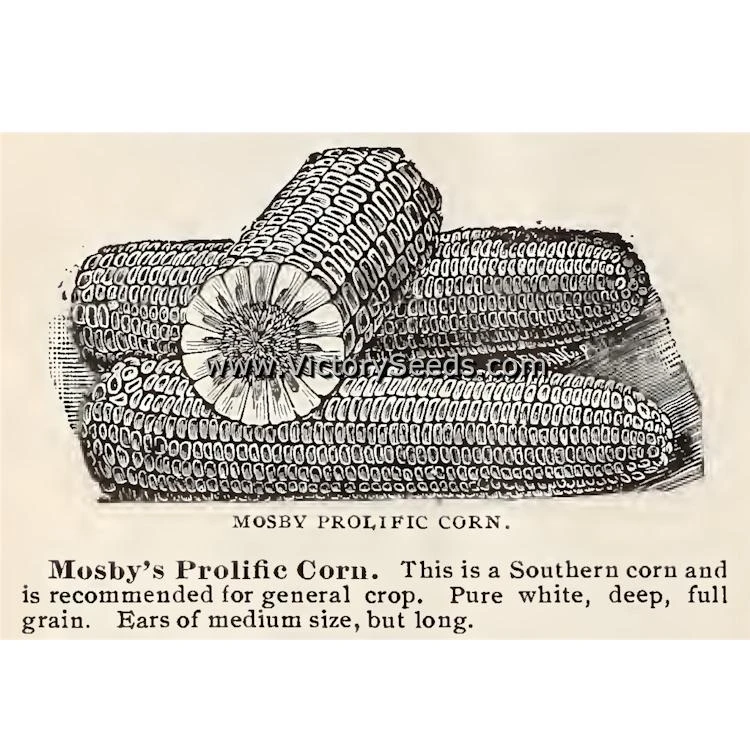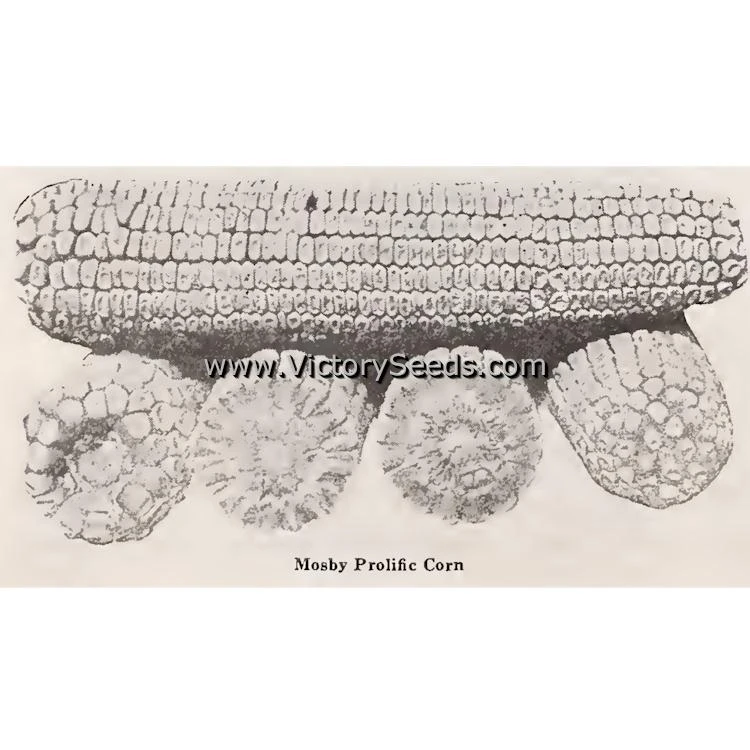 100 days — ‘Mosby Prolific’, also found incorrectly marketed as “Moseby” Prolific, is one of the old “prolific” dent corn varieties. Its stalks are sturdy and large, often growing ten to twelve feet in height, and generally bear two ears per stalk, but can develop up to four. The ears are eight to nine inches long and about six inches in circumference with kernels and cobs that are white in color.