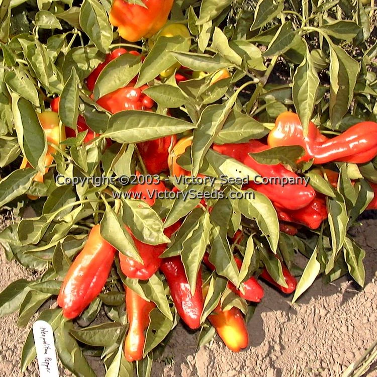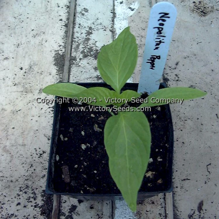 65 days — ‘Neapolitan’ is a very early, sweet and mild pepper with three lobed fruit, measuring four inches by two inches that grow upright on the sturdy, compact plants. It makes a beautiful show of changing colors. Starting with a light yellowish-green hue it changes to a darker lime green then to burnt-orange and finishing in a brilliant red. Very beautiful with all the different shades and colors on the plant at the same time.