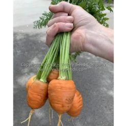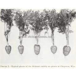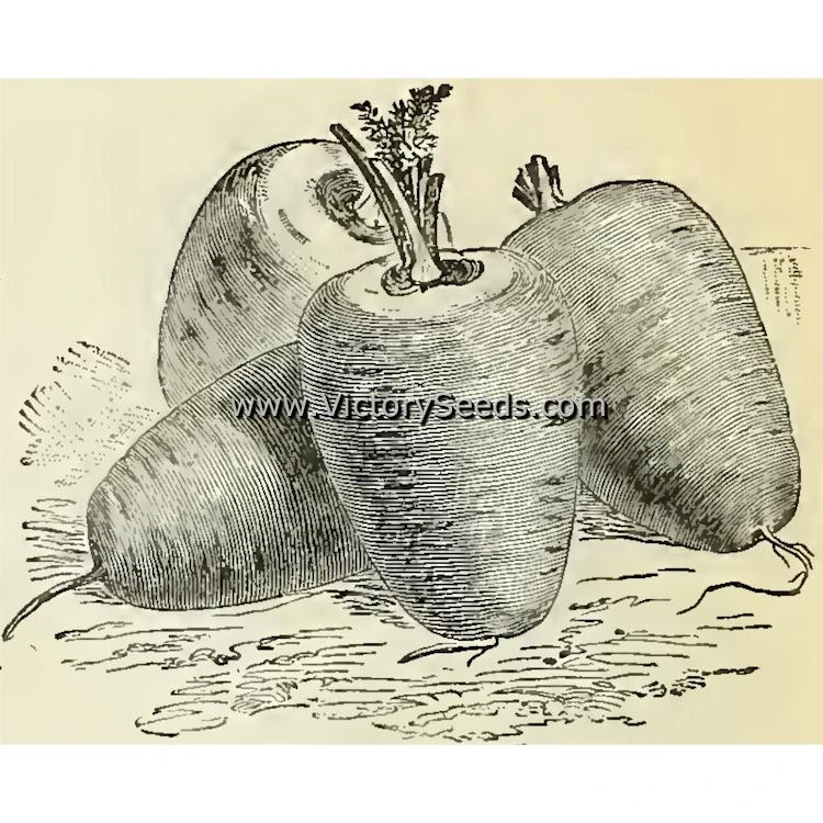 Originating in France where it was known as ‘Guerande’, both W. Atlee Burpee & Co. and by James J. H. Gregory introduced it as ‘Oxheart’ to the American gardening public in 1884. Over the years, various seed merchants have sold it under the synonyms “Early Gem,” “Early Guerande,” “Early Oxheart,” “Gem,” “Guerande,” “Half Long Guerande,” “Half Long Stump Guerande,” “Half Long Stump Rooted Guerande,” “Large Scarlet Stump Rooted,” and “Norfolk Gem.”[1] Each packet contains 0.5 gram, which is approximately 250 seeds.