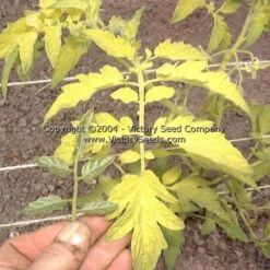 In 1990, author and tomato authority Craig LeHoullier received a strain of “mortgage lifter” from Charlotte Mullens of West Virginia.[1] By about 2000, this interesting, lutescent leaf variant showed up sport in Craig’s garden and seemed to be quite stable. He sent us seeds and we introduced it to gardeners in 2005. Each packet contains approximately 20 seeds.