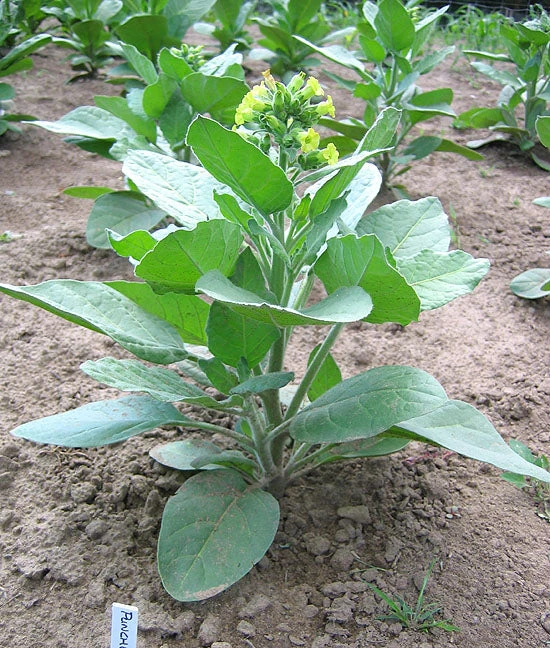 Punche is one of the earliest maturing “rustica” varieties at just 35 days. It is a good choice for growers with a very short season or as a late season crop. It can be planted out earlier than many other tobaccos and mature plants are frost tolerant. As with other rustica varieties, it has a very high nicotine content.