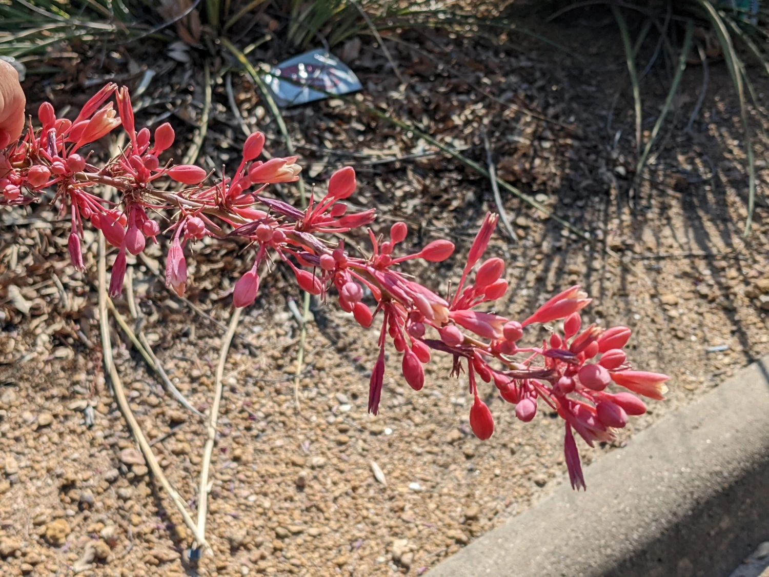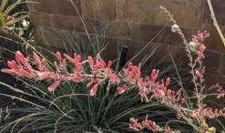 3-4 foot long leaves with flower stalks up to 6 feet long that gracefully arch down. Give it full sun and once established you don’t have to do a thing to it except enjoy the lovely flowers during the heat of the summer.