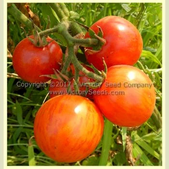 80 days, indeterminate — The regular leaf vines of ‘Red Zebra’ are quite productive. Its fruit range in size from 1½ to 2½ inches in diameter, weigh from two to three ounces each, are globe-shaped, and red with jagged, vertical, orange colored mottling. They are juicy and mild flavored with salty notes and a delicious, slightly tart aftertaste.