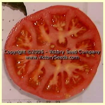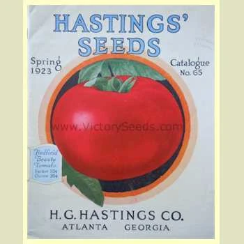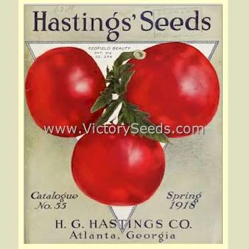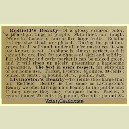 90 days, indeterminate — Also known as ‘Hastings’ Redfield Beauty’, the fruit are beautiful, smooth, globe to slightly oblate-shaped, weighing six to twelve ounces, pink in color and are borne in clusters of three to five tomatoes. Excellent flavor, mild but slightly tart. Good slicing variety.