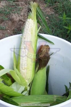 ‘Silver King’ was developed by Funk Brothers Seed Company of Bloomington, Illinois as a selection, and subsequent stabilization of, ‘Silvermine‘ and introduced in 1903.[2] In 1904, Professor Moore of the Wisconsin Agricultural Experiment Station obtained a sample, described the variety as, “… a white dent corn with medium sized ears. The kernels are medium deep and have a rather rough dent. The stalks reach a good height and are very leafy hence the excellence of this variety for silage purposes,” and released it into Wisconsin, presumably as ‘Wisconsin No. 7’.[1] Each ounce is approximately 70 seeds.