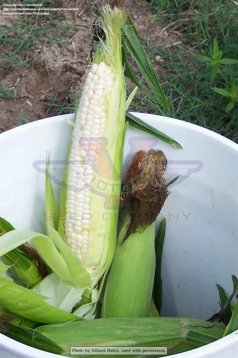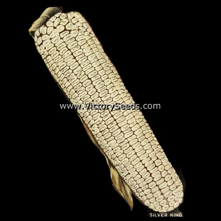 100 days — ‘Silver King’ dent corn, also known as ‘Wisconsin No. 7’, is an old dent-type, commercial heirloom roasting corn variety dating back to the turn of the 20th Century. It is not to be confused with the newer, hybrid sweet corn variety that is being sold under the same name. The ears grow eight to nine inches long and have sixteen rows of white kernels. This variety is also used for grits, meal and feed.