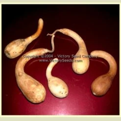 100 days — As its name implies, the fruit of ‘Small Spoon’ gourds are fairly small, reaching five to six inch long. Their narrow, curved necks expand out to two to three inches at the blossom end, are bi-colored orange and green, and dry to the typical pale tan color. Its flowers are yellow and not white like most gourds.