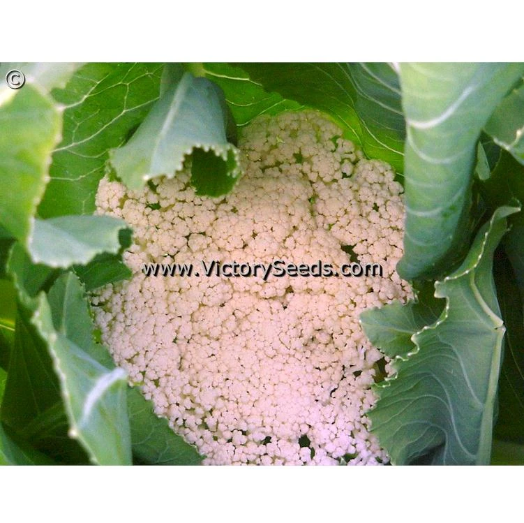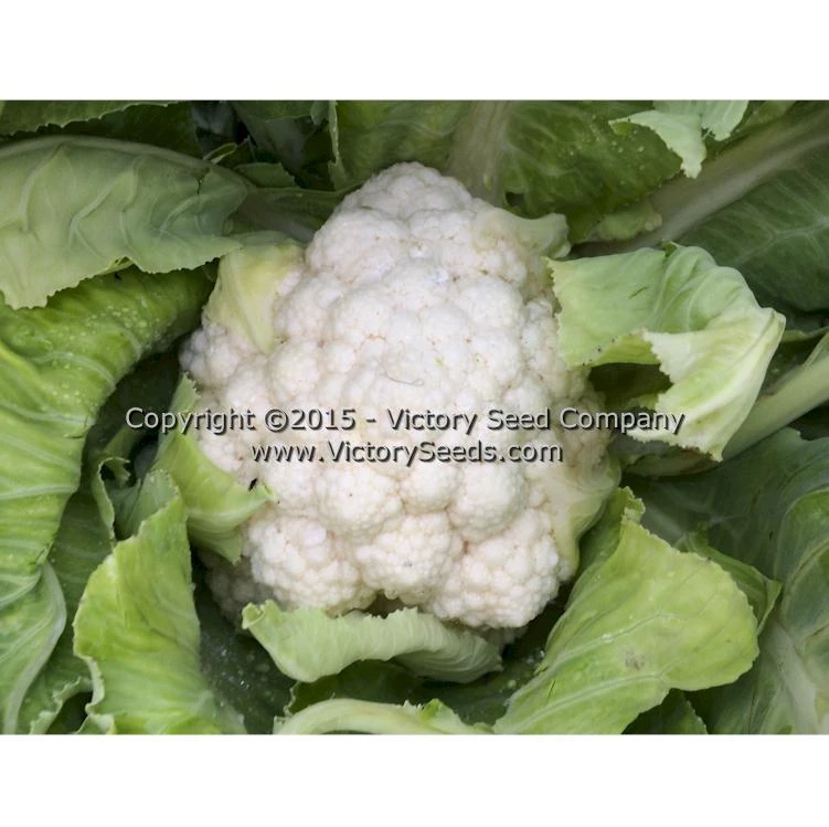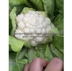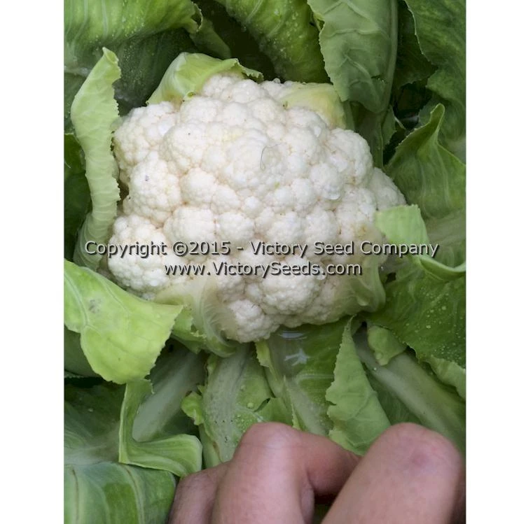 68 days — In the category of “snowball-type” cauliflower varieties, ‘Snowball Self-Blanching’, as its name implies, has large wrapper leaves that curl inwards in the cool fall weather. This trait serves to help cover and protect the head and to help keep it blanched pure white in color. Because of this trait, ‘Snowball Self-Blanching’ does not require tying until heads are six to eight inches across, and that is only if you are a commercial producer. Here on our farm, for our personal use, we don’t bother tying and as you can see in the photo, the heads remain a very bright white.