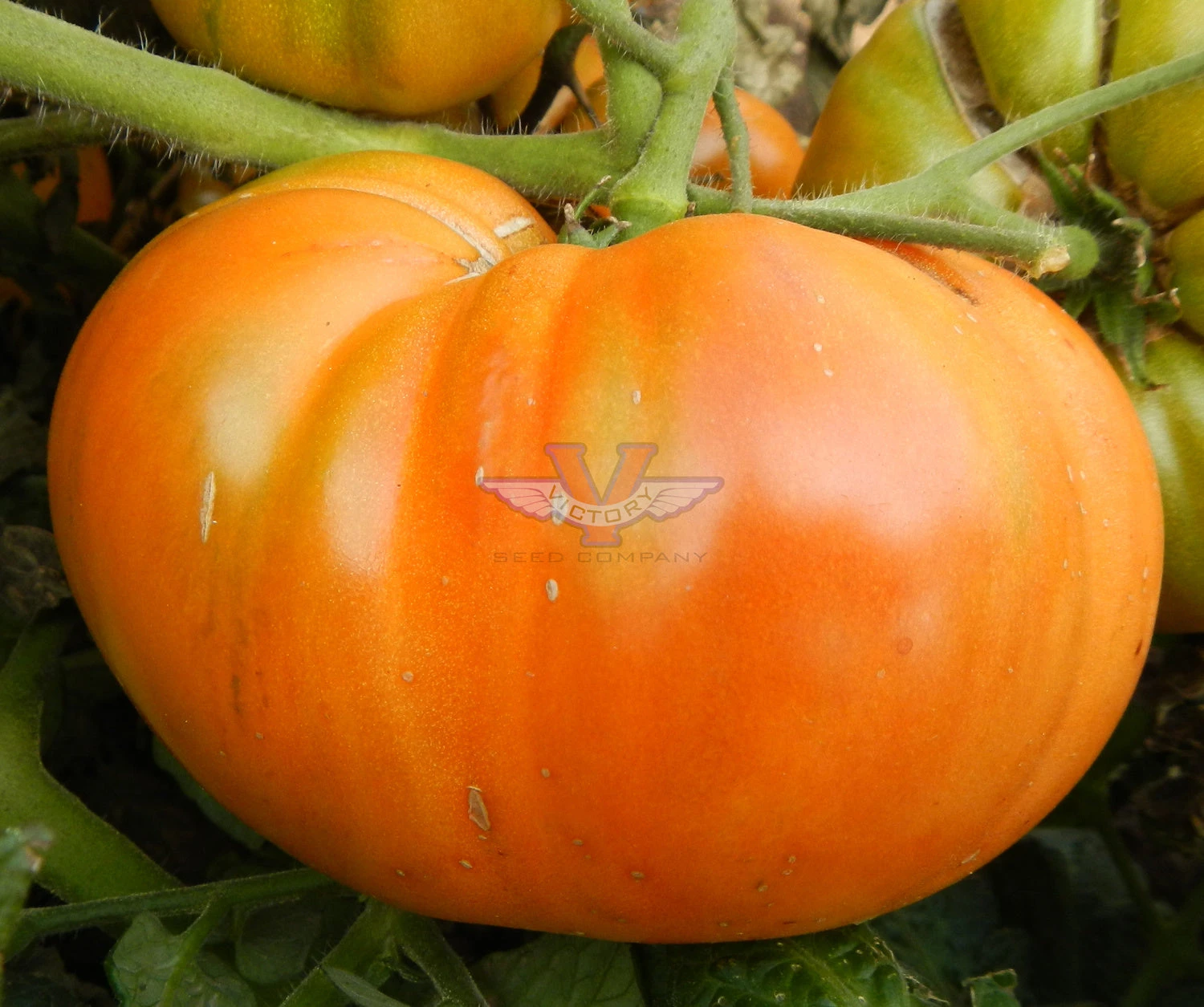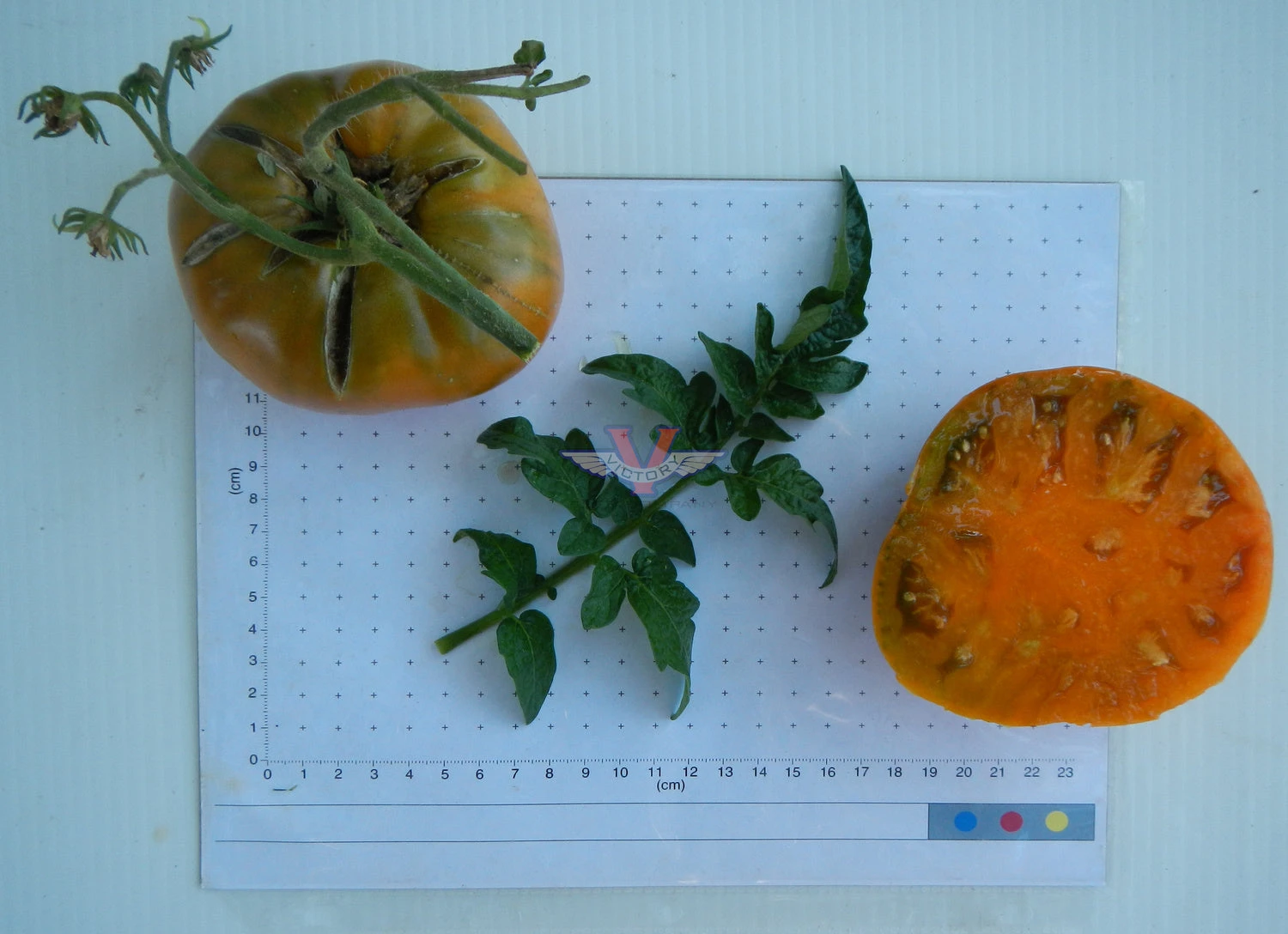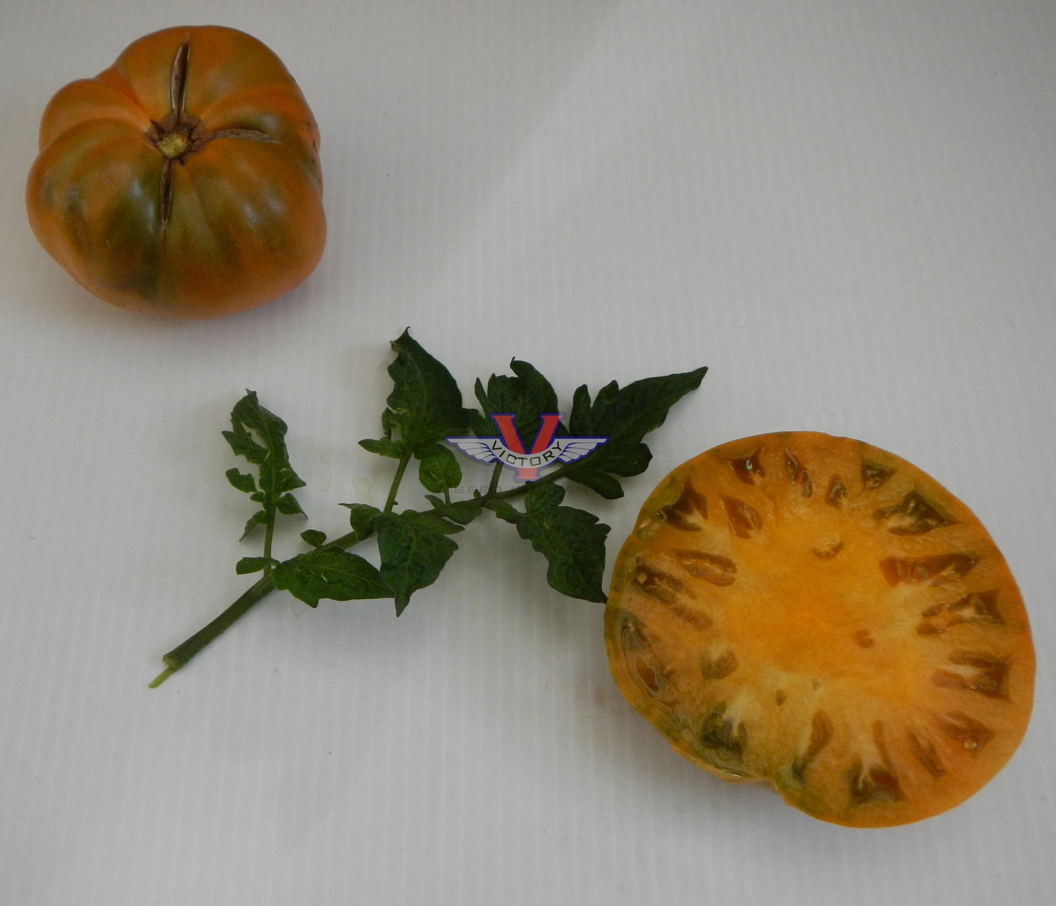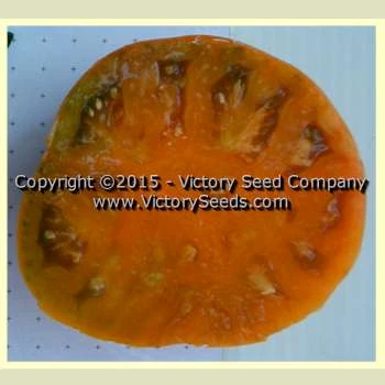 Indeterminate. 65 days, dwarf — The vigorous, dwarf, rugose, regular leaf plants are relatively compact, quite early to produce and prolific. Producing a good yield of medium to large sized (six to twelve ounces) oblate uniquely colored tomatoes that are essentially the first “black/orange” variety we’ve seen – orange flesh with green overtones, and somewhat amber/orange/green in appearance. The flavor can be a bit variable season to season, but at its best, it has an absolutely delicious, smokey flavor.