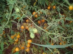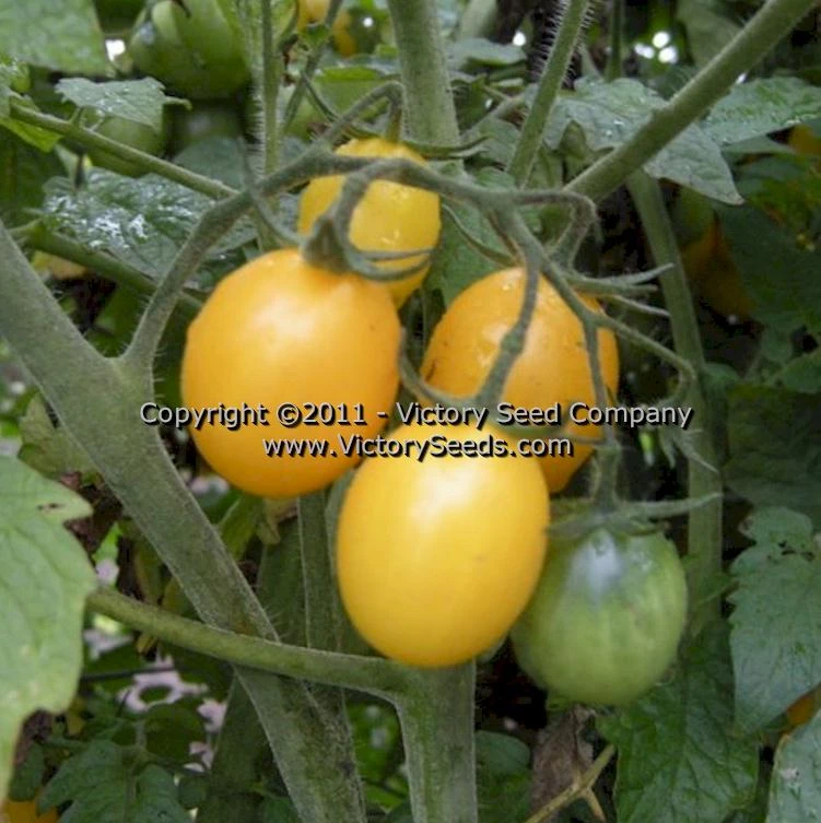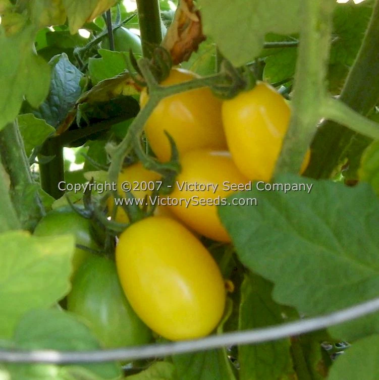 70 days, indeterminate — ‘Yellow Plum’ is a very old variety that has been popular among gardeners for a very long time. The regular leaf plants are large, open, very productive, and do benefit from sturdy support.